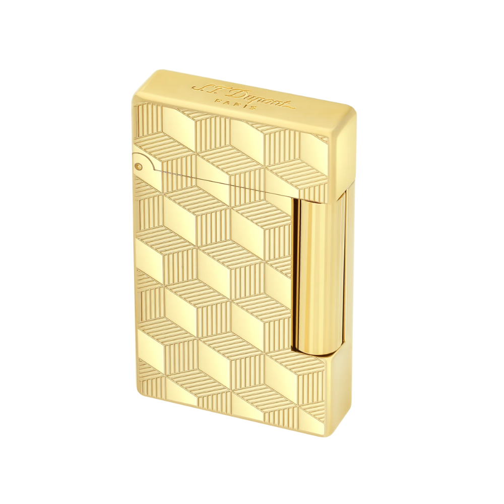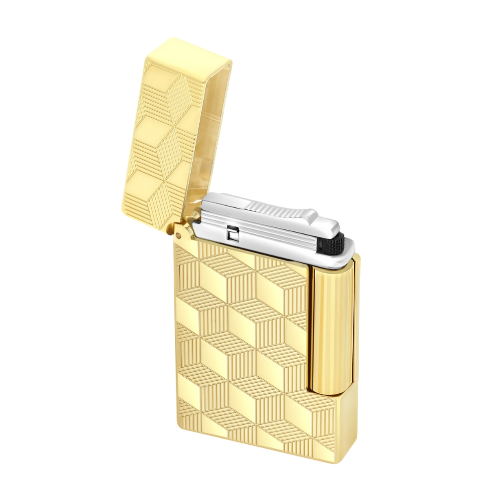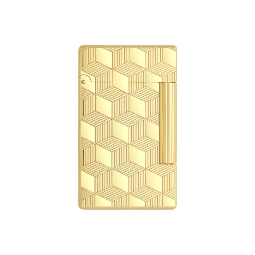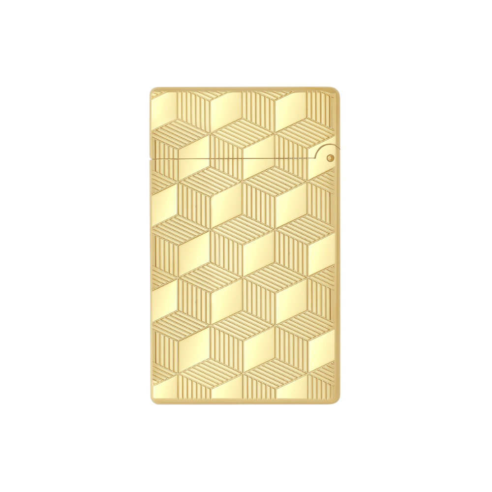 Encendedor Initial, con decoración de guilloche en forma de cubo, acabados dorados. Con una llama amarilla doble.
