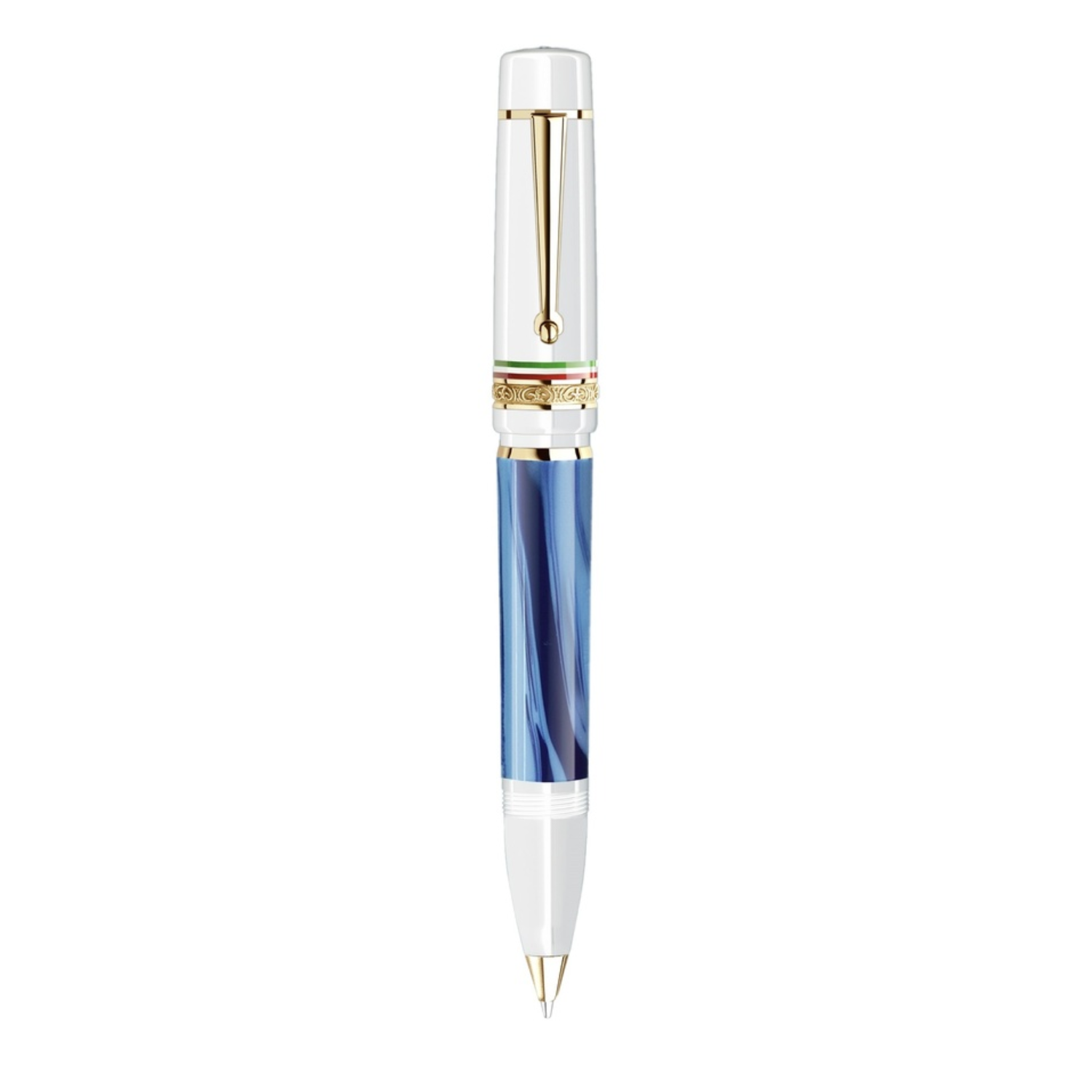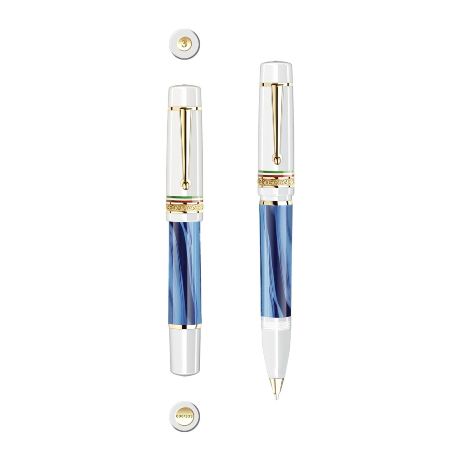 El diseño se completa con refinados anillos metálicos: cuatro en la base del capuchón y tres en el cuerpo, estos últimos evocando los colores de la bandera italiana. Este roller combina artesanía, simbolismo y lujo contemporáneo.