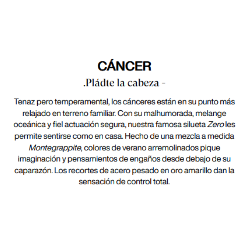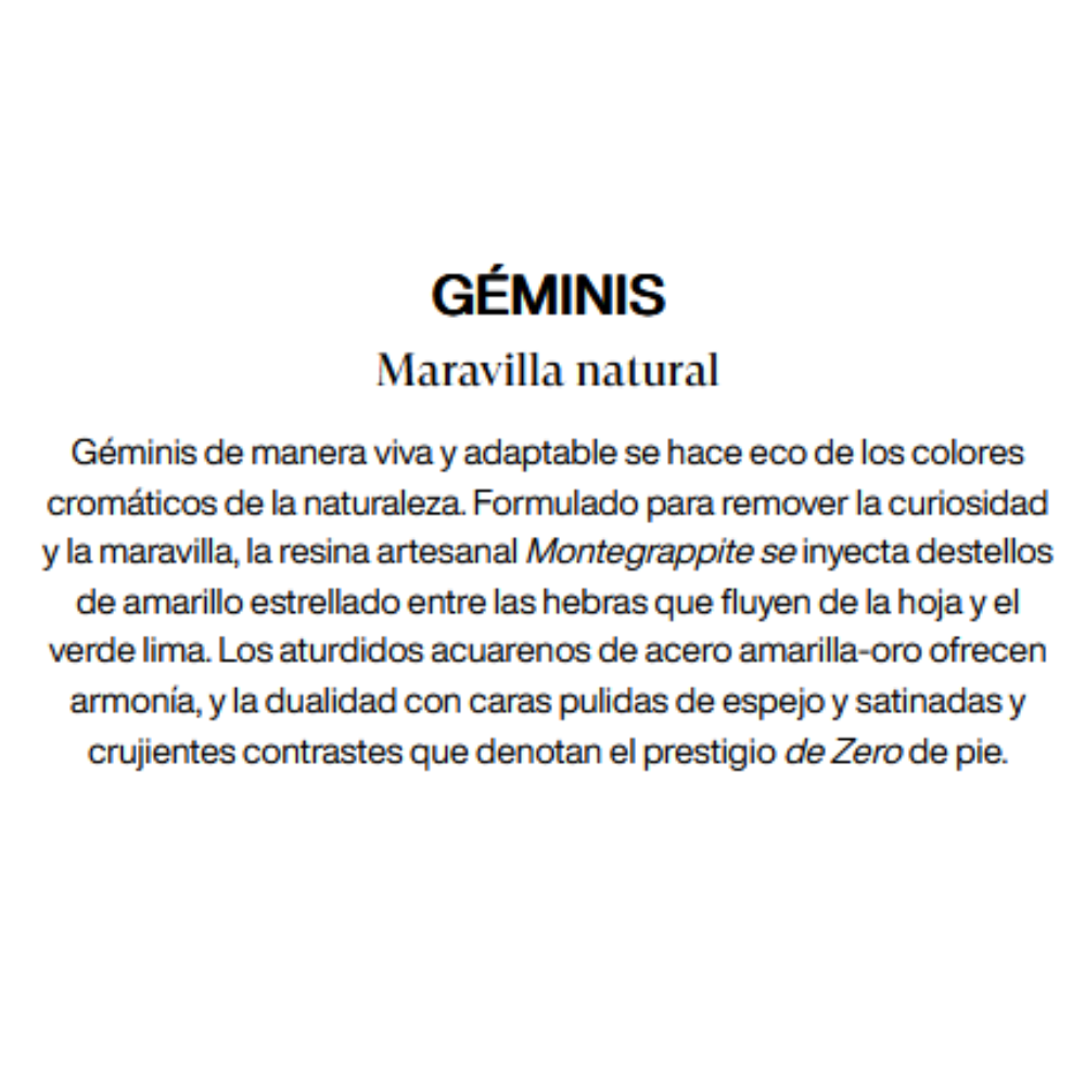 Las estrellas se alinean en nuestra moderna y versátil silueta Zero. Los hilos de resina de colores representan los rasgos de cada signo astrológico, mezclado artesanalmente en vibrantes constelaciones Montegrappitas. Bajo el cristal de zafiro, los sellos contemporáneos y de metal sólido son insignias de identidad cósmica. Elija entre tres modos.open o edición limitada para encontrar su pareja perfecta