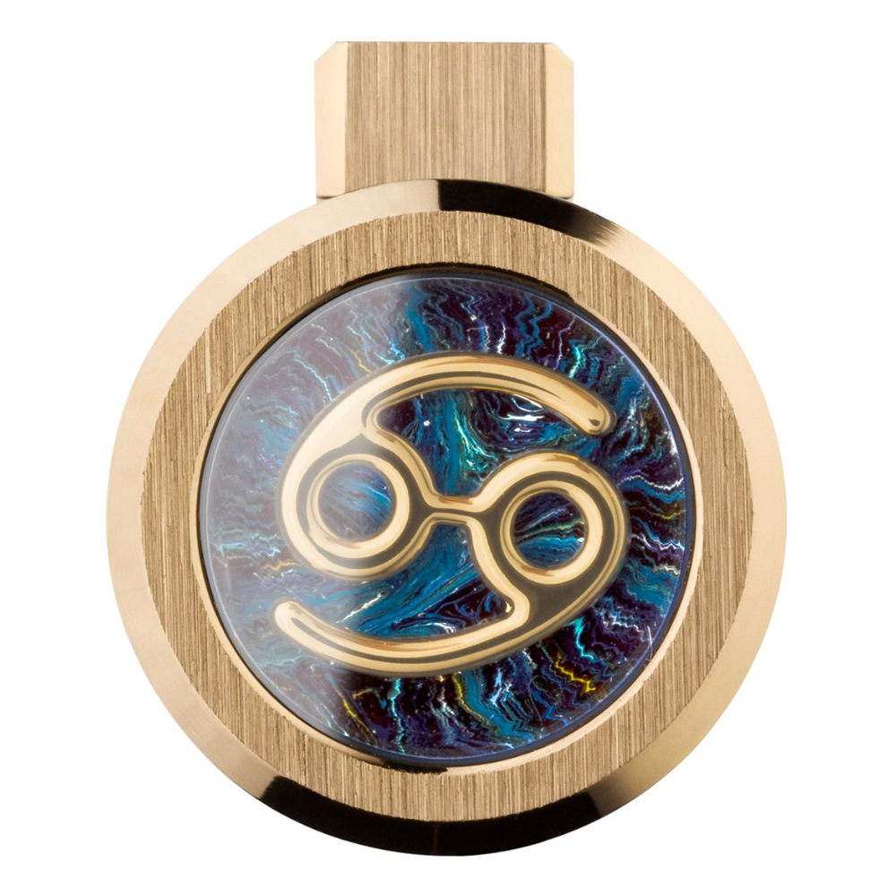 La elegante sencillez de Zero proporciona un lienzo ideal para la exploración astrológica. Las texturas de resina sinuosas están enmarcadas por el hardware de acero atrevido salpicado de cristal de zafiro: una ventana sobre los símbolos zodiac fundidos de metal sólido.