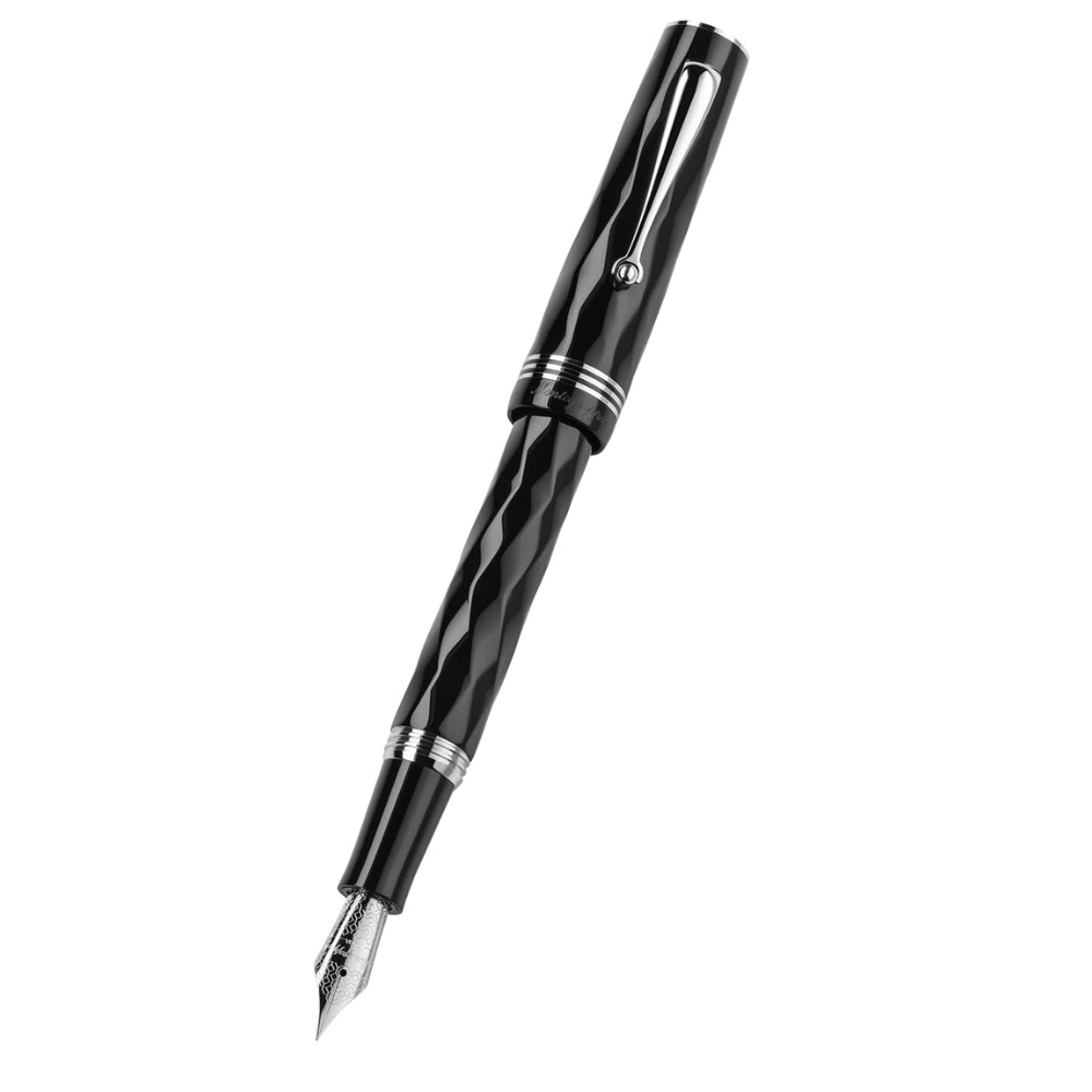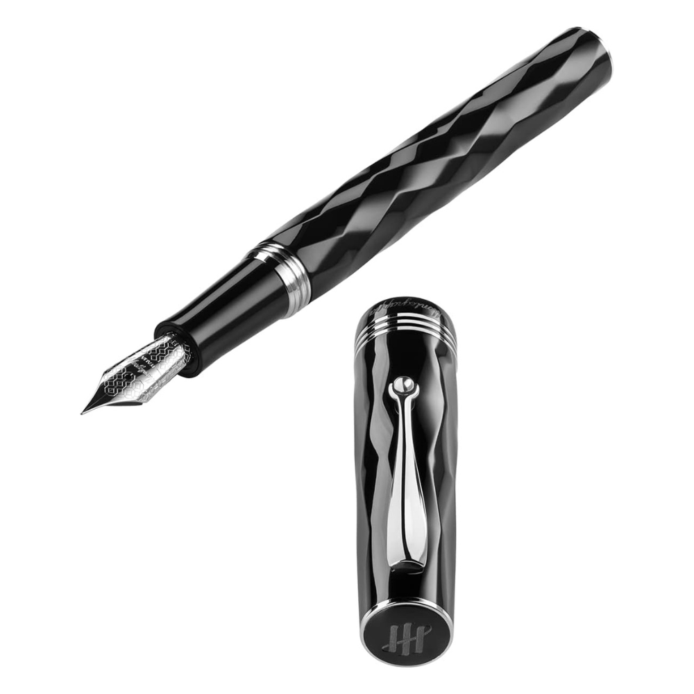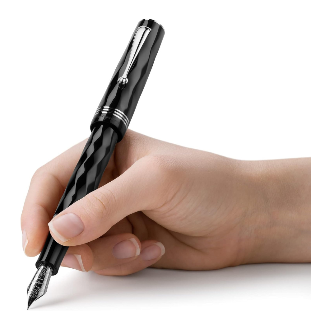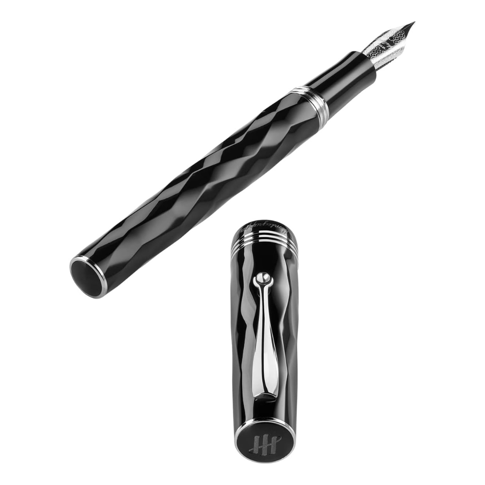 Fabricada en resina preciosa de color negro intenso, esta pluma fuente combina perfectamente lo tradicional con lo contemporáneo. Su cuerpo facetado y su capuchón metálico reflejan la luz con sutil elegancia, mientras que el punto de acero inoxidable garantiza una escritura fluida, precisa y placentera.