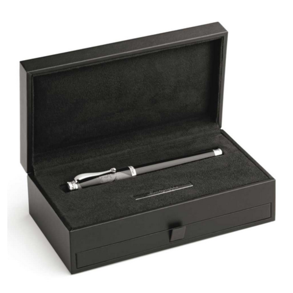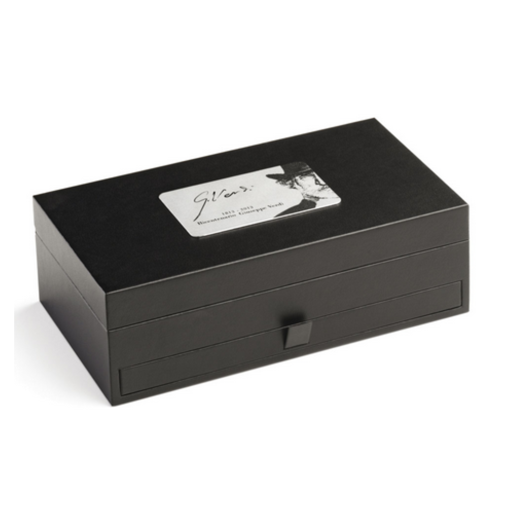 Un sistema de llenado de cartuchos-convertidor está instalado en la edición de la pluma de fuente, junto con un llamativo punto de oro de 18K chapado en rodio. Al igual que con todas las series de edición limitada de Montegrappa, los bolígrafos Giuseppe Verdi se presentan en una caja señorial, perfectamente adaptada para albergar el opulento instrumento de escritura.
