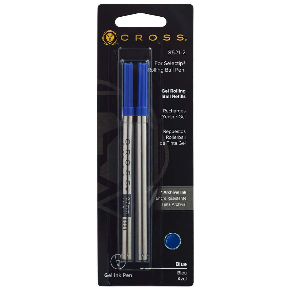 Repuesto Cross para Roller. Ideal para quienes buscan repuestos de alta calidad para sus Roller Cross. Este paquete incluye dos unidades con tinta de color azul, asegurando una escritura suave y continua. El diseño exterior en color plateado aporta un toque de elegancia a su estuche de escritura. Perfecto para uso profesional o personal.